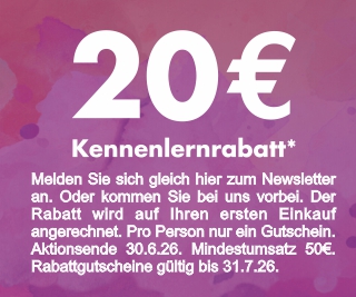 bis 30.6. 2026Kennenlernrabatt | ![]() | KennenlernRABATT.Beim Newsletter anmelden und 20 € Rabatt sichern. Aktion läuft bis zum 30.6.2026 |